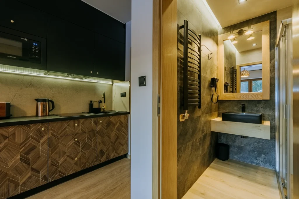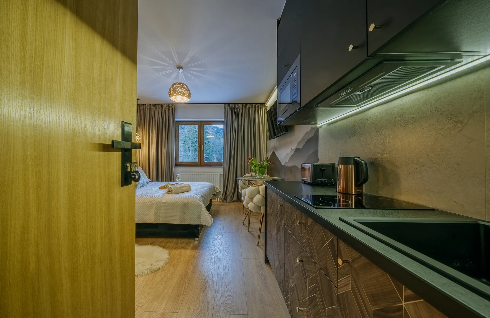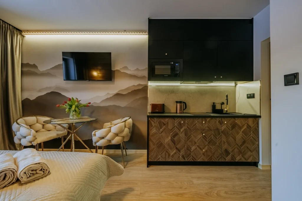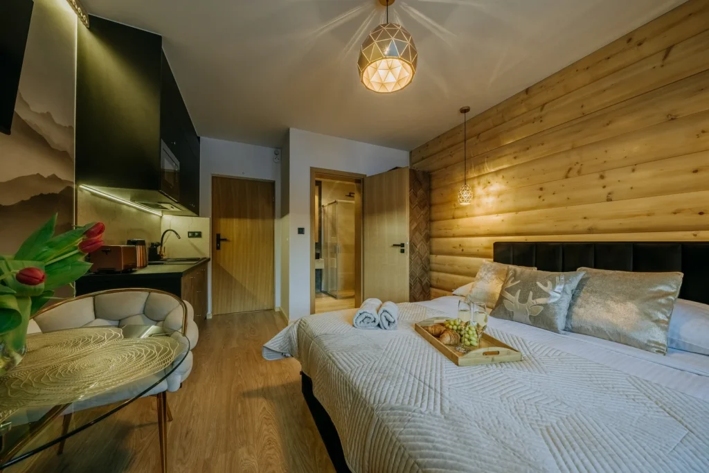To doskonały wybór dla osób ceniących ciszę, kameralną atmosferę i górski klimat. Przemyślany układ wnętrza, funkcjonalne wyposażenie oraz parterowe położenie z widokiem na Giewont sprawiają, że pobyt jest komfortowy od pierwszych chwil. Drewniany akcent w zagłowiu łóżka podkreśla przytulny charakter studia i sprzyja wyciszeniu po dniu spędzonym w górach.