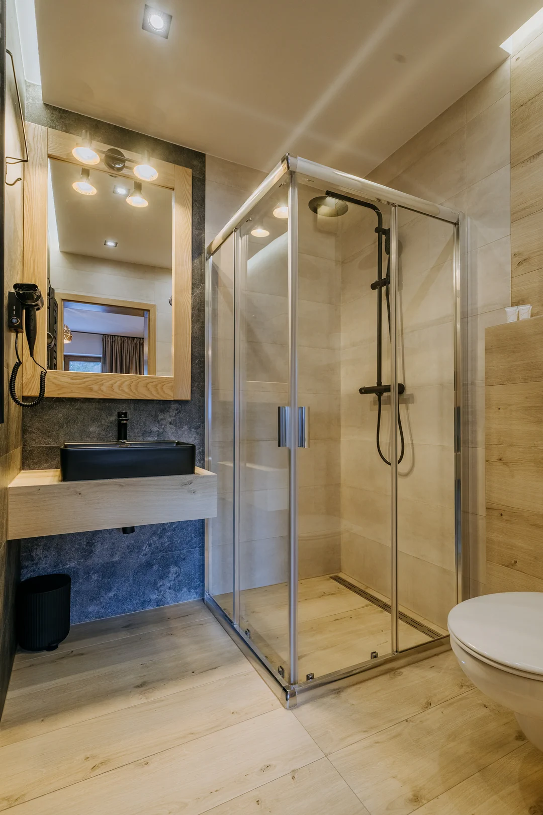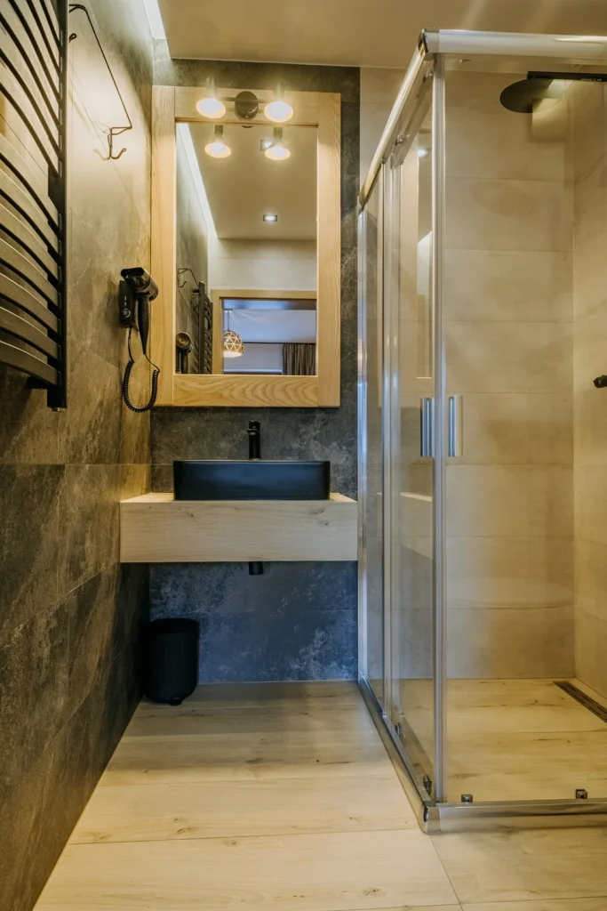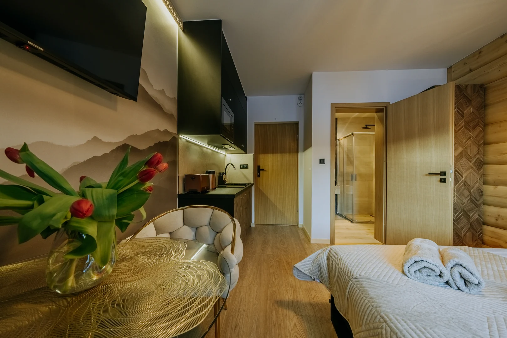To doskonały wybór dla osób ceniących ciszę, kameralną atmosferę i górski klimat. Przemyślany układ wnętrza, funkcjonalne wyposażenie oraz parterowe położenie z widokiem na Giewont sprawiają, że pobyt jest komfortowy od pierwszych chwil. Drewniany akcent w zagłowiu łóżka podkreśla przytulny charakter studia i sprzyja wyciszeniu po dniu spędzonym w górach.