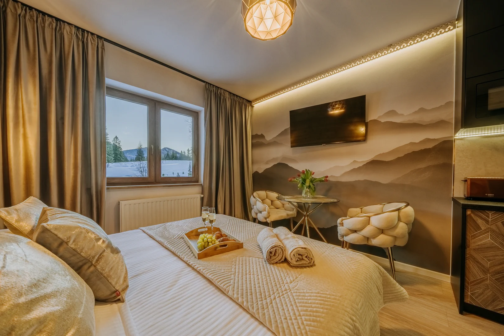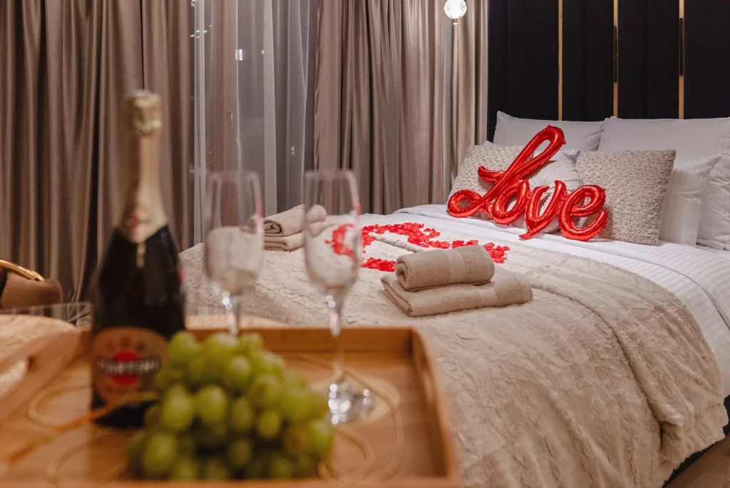 Chcesz sprawić niespodziankę bliskiej osobie lub uczcić wyjątkową chwilę podczas pobytu? Na życzenie Gości możemy przygotować romantyczny wystrój apartamentu, obejmujący m.in. szampana, świece, płatki róż oraz czekoladki.